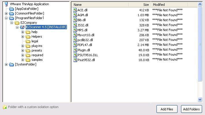 1. In the ThinApp Assistant, open the Files & Folders page. The files and folders are listed in the ThinApp Application tree, organized by installation directory.