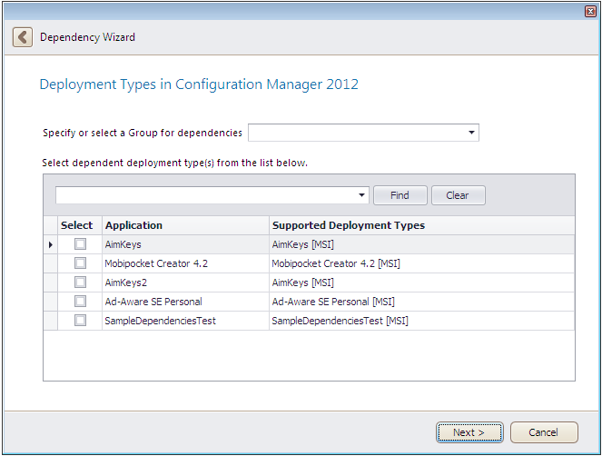 On the Deployment Types in Configuration Manager 2012 panel, you select dependent deployment types from the list.