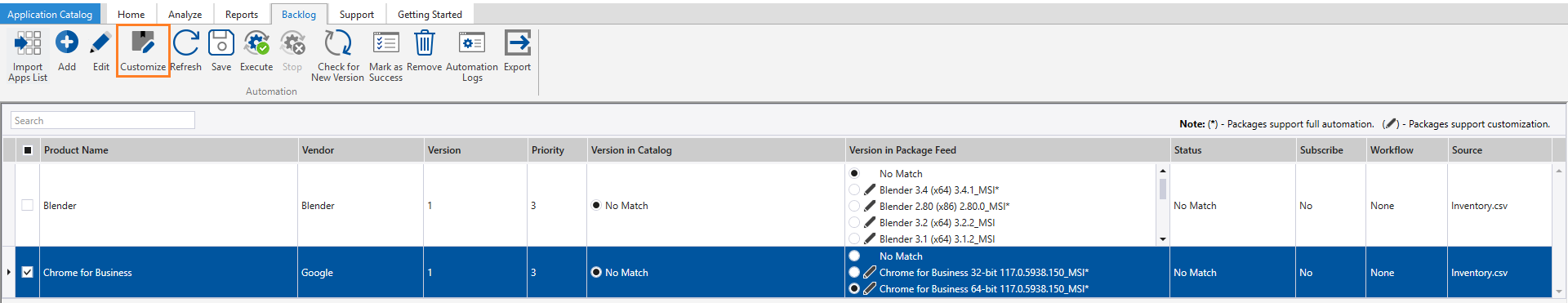 Clicking on the Customize button launches the Customization Wizard. The panels in the Customization Wizard are dynamic depending on the number of customization options available for the selected package. Options checked/unchecked in the Customization Wizard will be saved. When a new version of the package is executed manually or during automation, all the saved customization options are used to generate a transform (.mst) file and is imported along with the MSI package into the catalog.