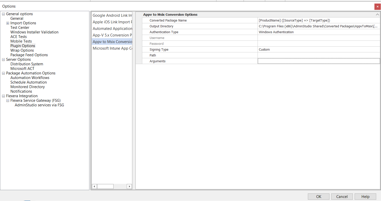 - In the middle pane, select Appv to Msix Conversion Plugin. The Appv to Msix Conversion Options are displayed in the right pane.