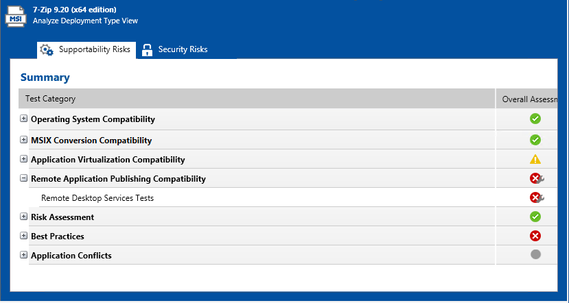 The Remote Application Publishing Compatibility tab of the Analyze Deployment Type View lists all of the individual errors and warnings that were generated by tests in the Remote Desktop Services Tests test group for the package.