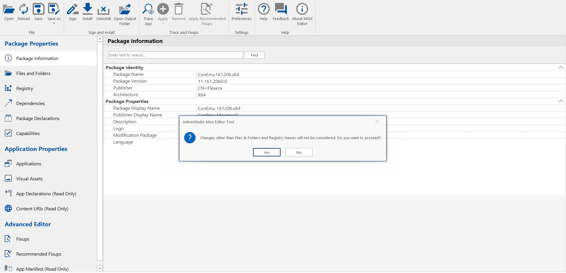 2. Modify the desired package properties for the selected MSIX Package. For more details, see Editing MSIX Packages.