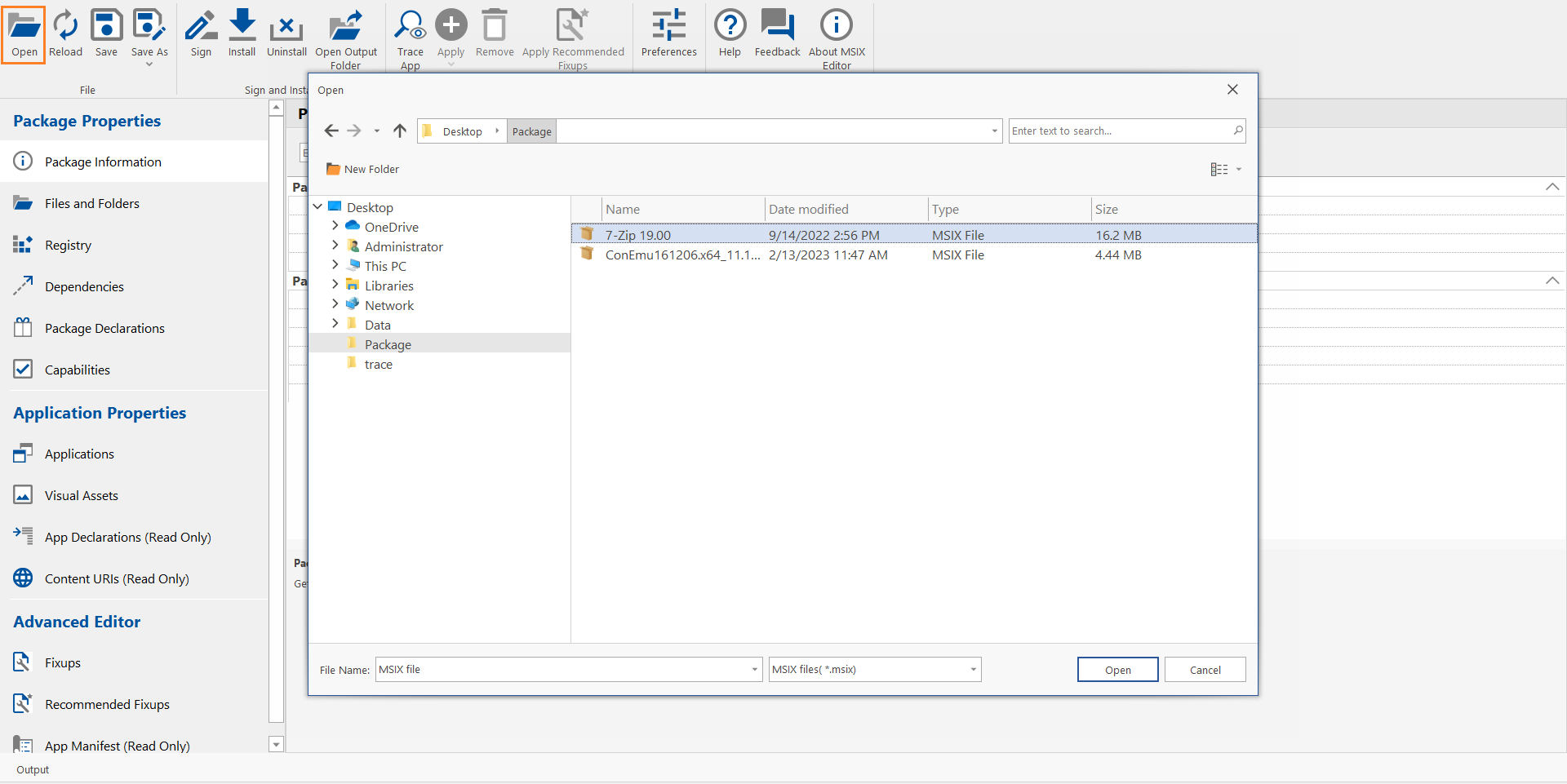 A dialog box appears, browse the desired MSIX package you want to edit, and then click the Open button.